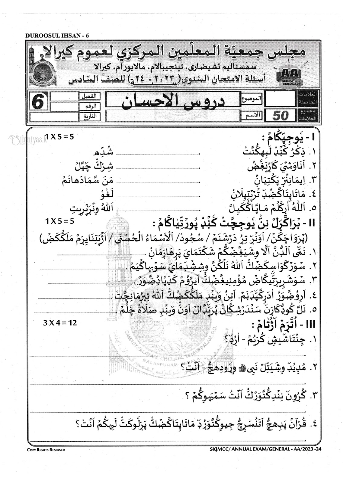 CLASS 6 | SAMASTHA MADRASA ANNUAL EXAM QUESION PAPERS | SKIMVB | 2024 | VIEW
